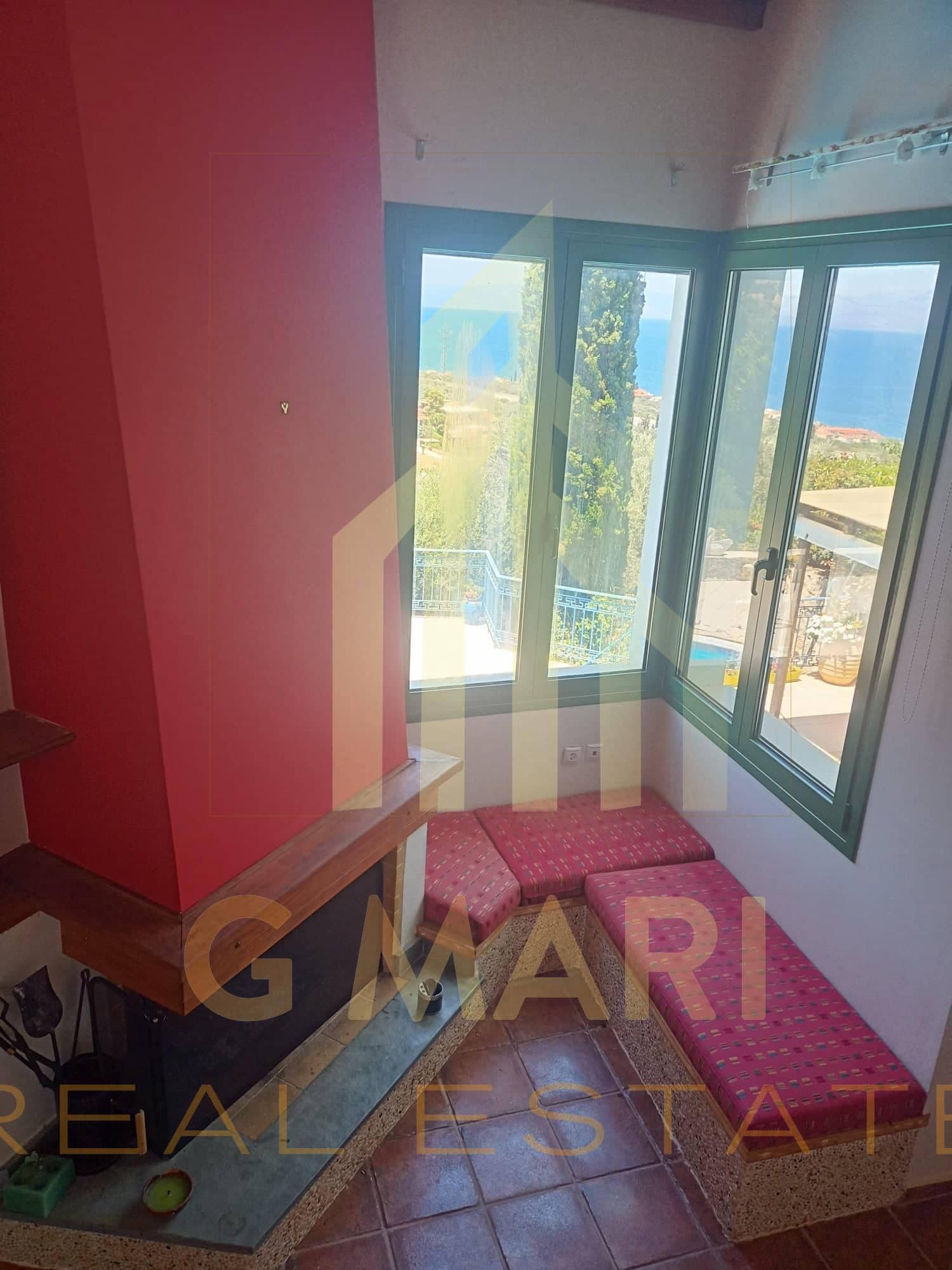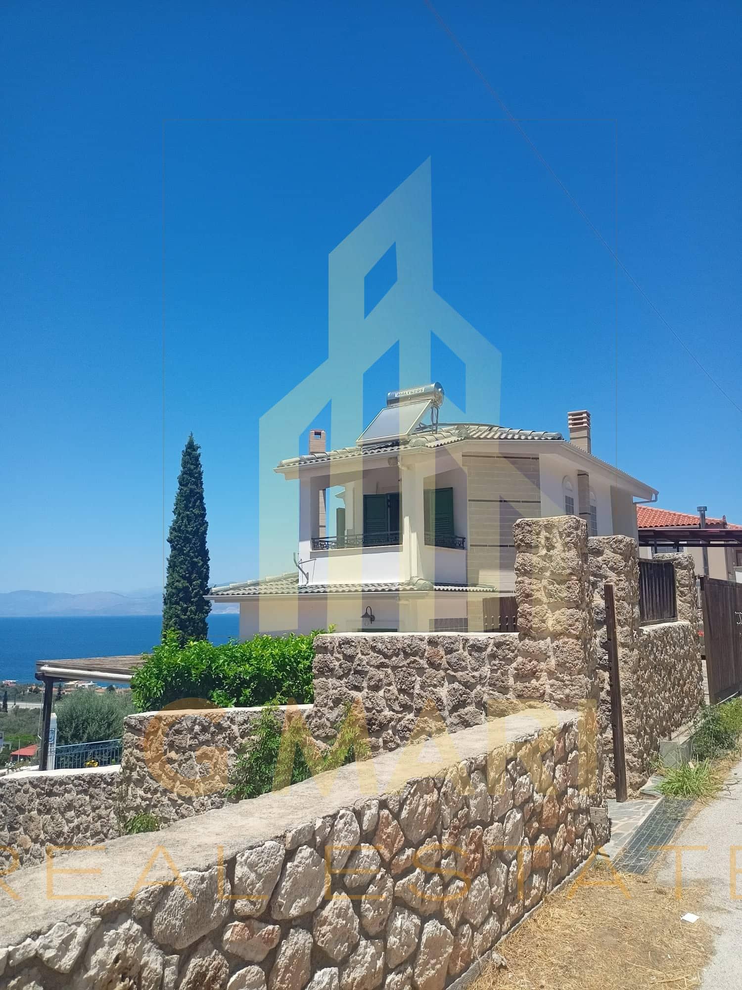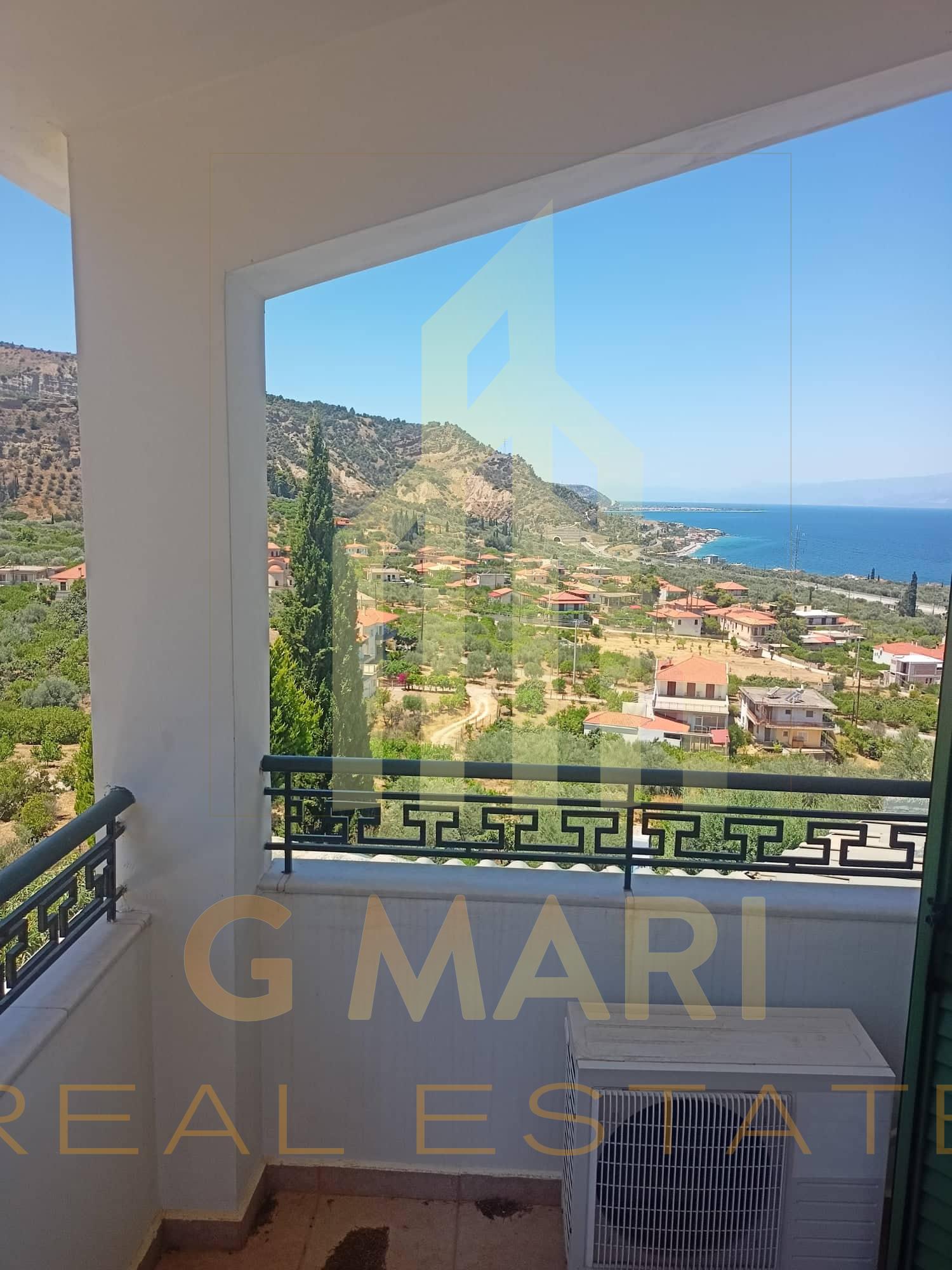 Detached house-maisonette of 150 sq.m. in total, with swimming pool, for sale in Derveni, Corinthia, on a plot of 450 sq.m. with an incredible view of the Corinthian Sea. It has 3 bedrooms, 2 luxurious bathrooms with Italian sanitary ware, a living room with a fireplace, an office space and interior wooden ceilings. It has a parking space, garden, barbecue, unlimited sea and mountain views, double glazing, screens, radiators, boilers, air conditioners and stone cladding. It is located at a distance of 1200 meters from the beach of Derveni and 1000 meters from the junction of the New National Highway (Derveni exit). Year of construction 2010. Energy certificate pending. Sale price €400,000. The address on the map is indicative of the area where the property is located.