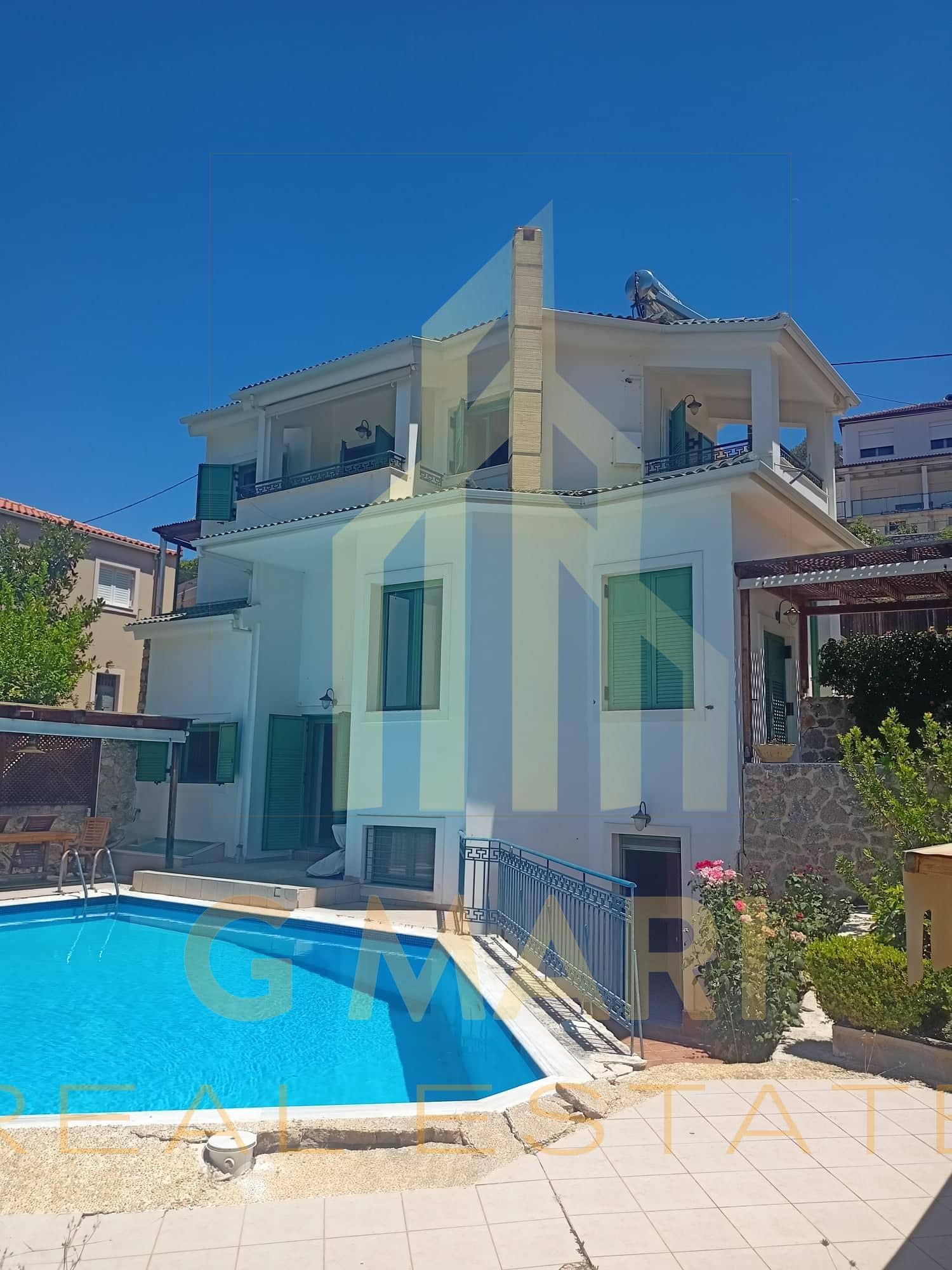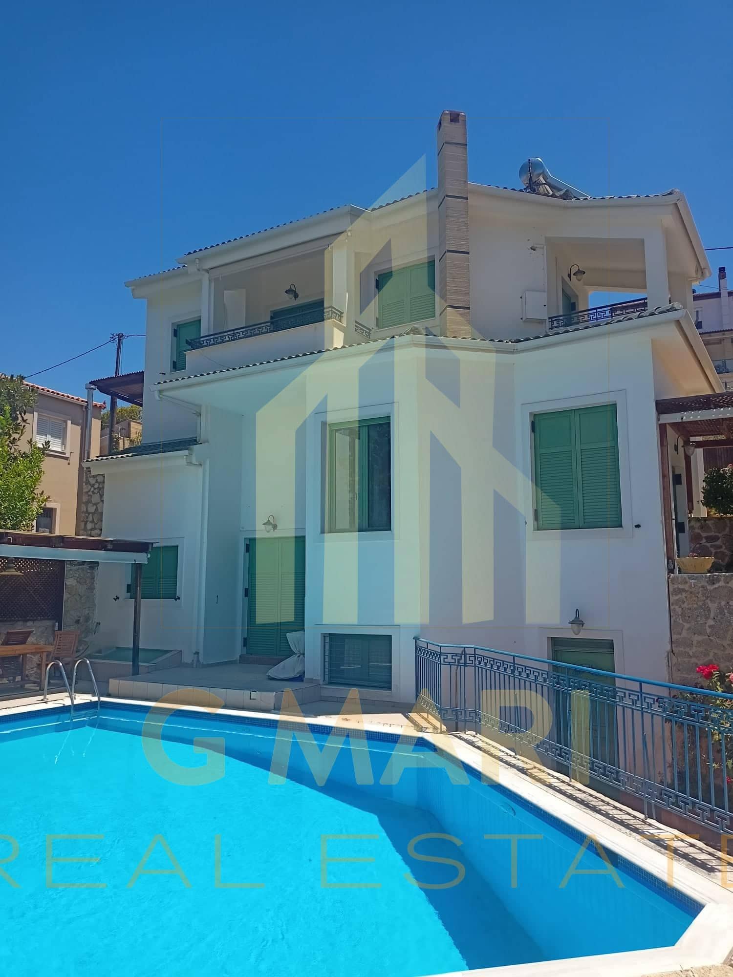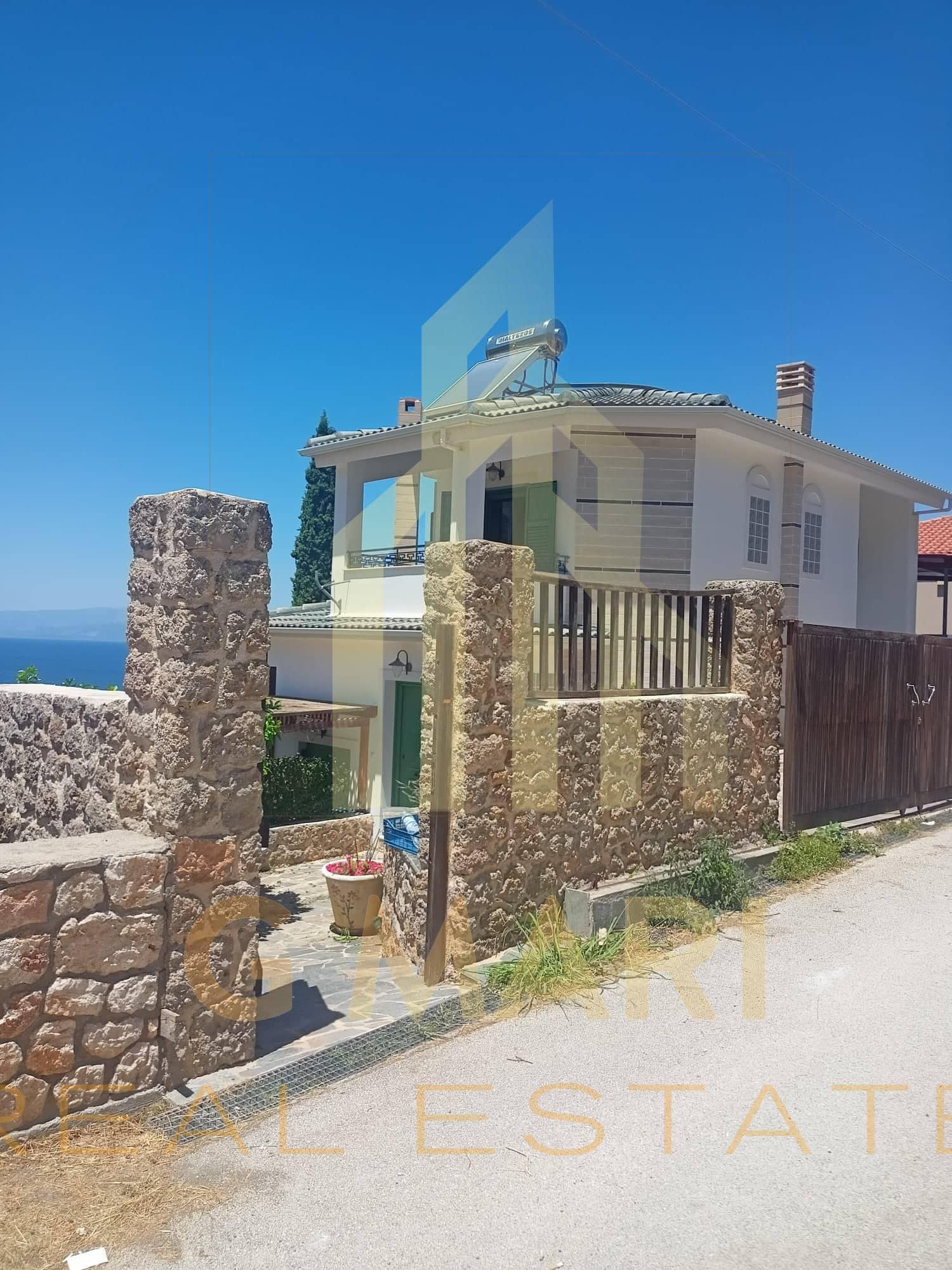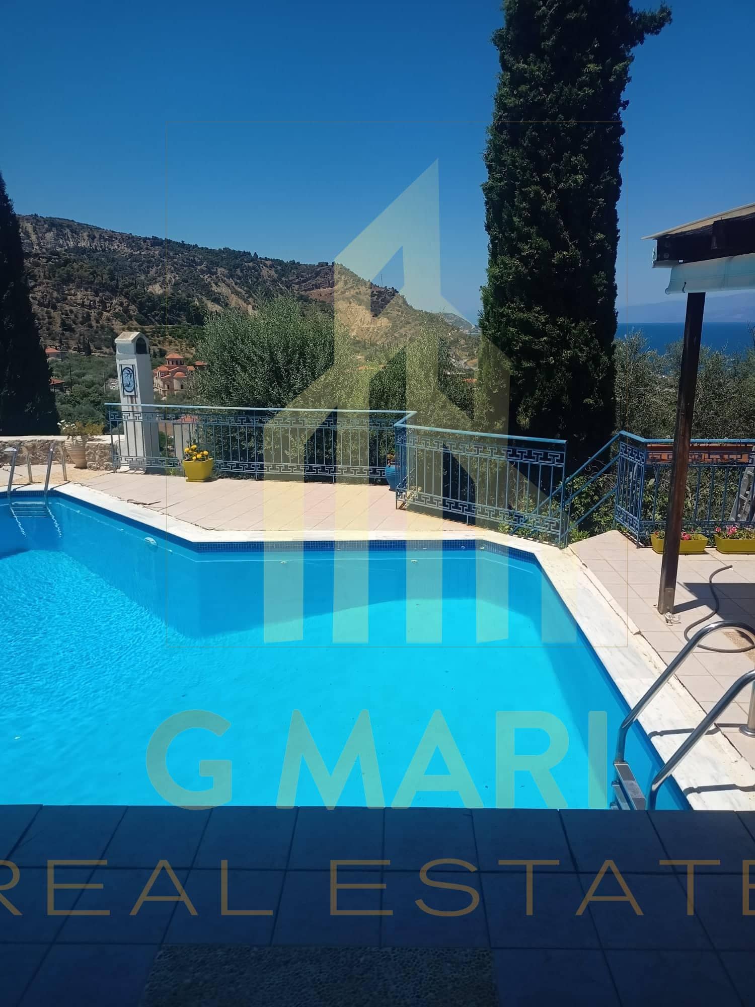 Detached house-maisonette of 150 sq.m. in total, with swimming pool, for sale in Derveni, Corinthia, on a plot of 450 sq.m. with an incredible view of the Corinthian Sea. It has 3 bedrooms, 2 luxurious bathrooms with Italian sanitary ware, a living room with a fireplace, an office space and interior wooden ceilings. It has a parking space, garden, barbecue, unlimited sea and mountain views, double glazing, screens, radiators, boilers, air conditioners and stone cladding. It is located at a distance of 1200 meters from the beach of Derveni and 1000 meters from the junction of the New National Highway (Derveni exit). Year of construction 2010. Energy certificate pending. Sale price €400,000. The address on the map is indicative of the area where the property is located.