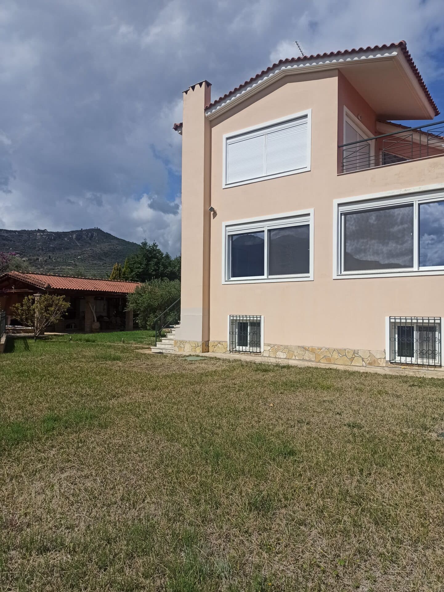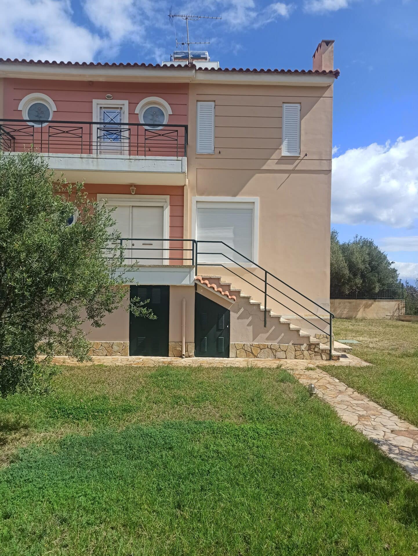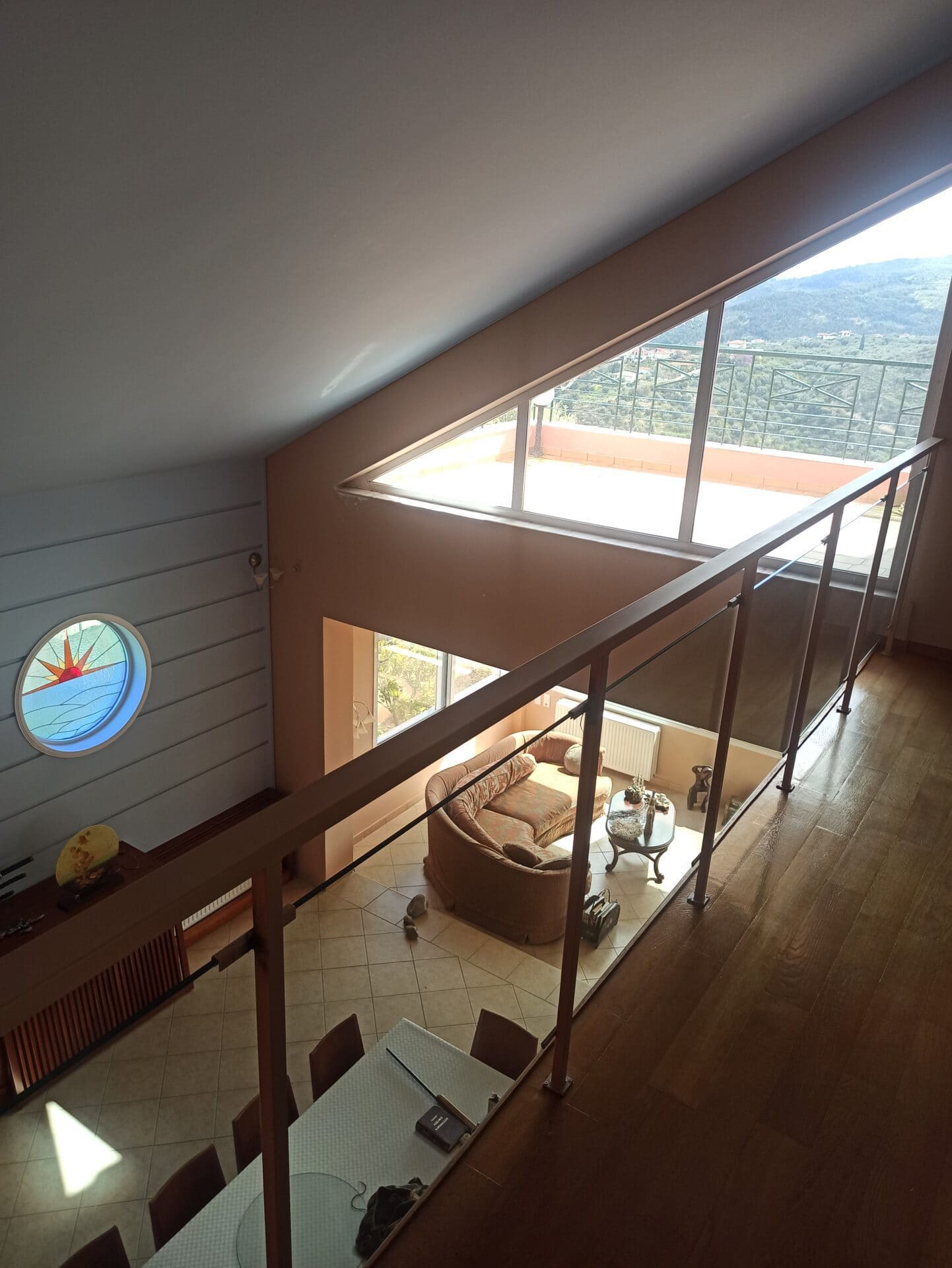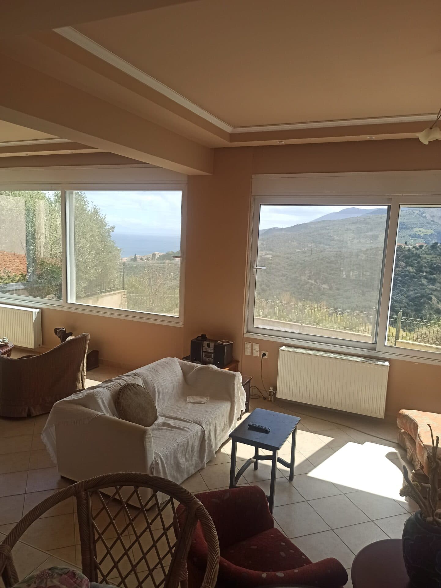 For sale a luxury three-storey maisonette in Ano Akrata, Prefecture of Achaia, Ampelos area, with a total area of 340 sq.m. , (230 sq.m. first floor + second floor) and basement (110 sq.m.) with 4 bedrooms, 2 living rooms, fireplace, 2 kitchens, 5 bathrooms, autonomous oil heating, heavy-duty aluminum frames, alarm, solar, 3 air conditioners, 4 balconies overlooking the sea, yard, garden, 2500 sq.m. , swimming pool, storage room, barbecue and closed garage. Year of construction 2006. Price: 600,000 euros. The address on the map is indicative of the area where the property is located.