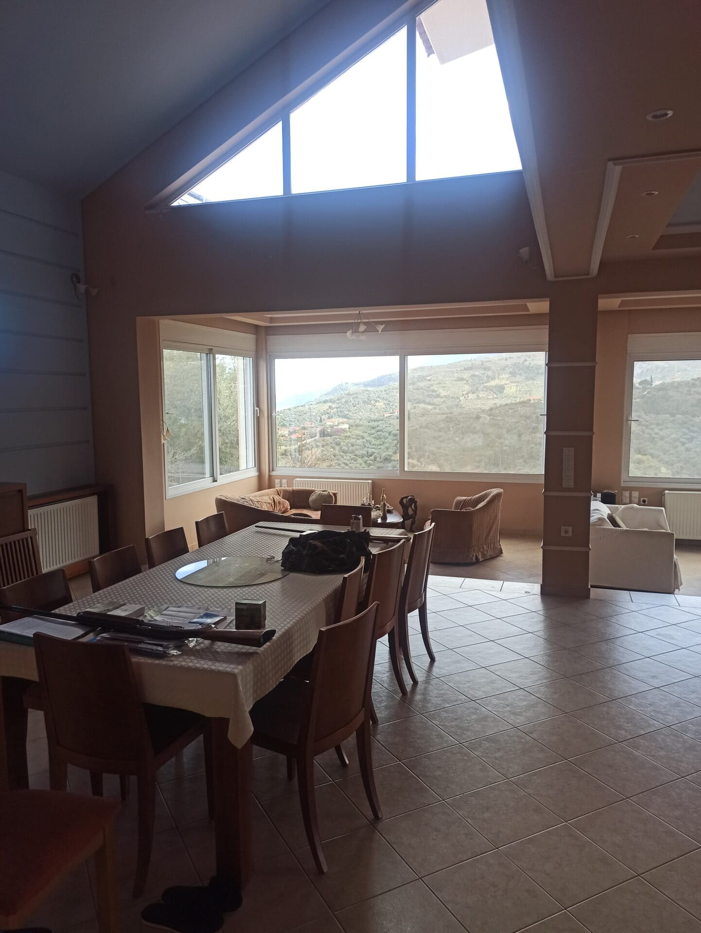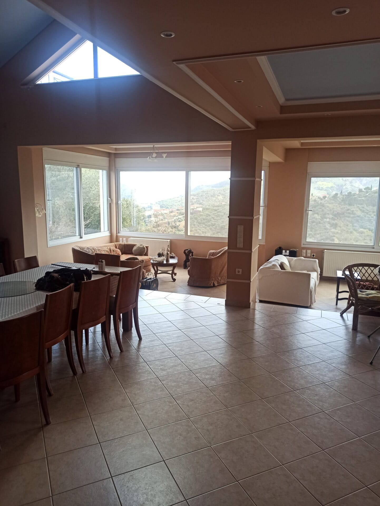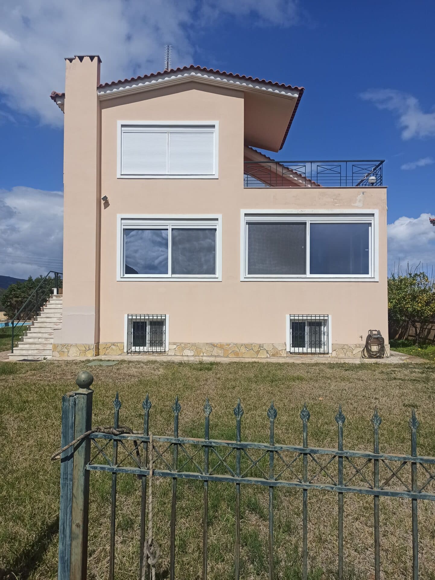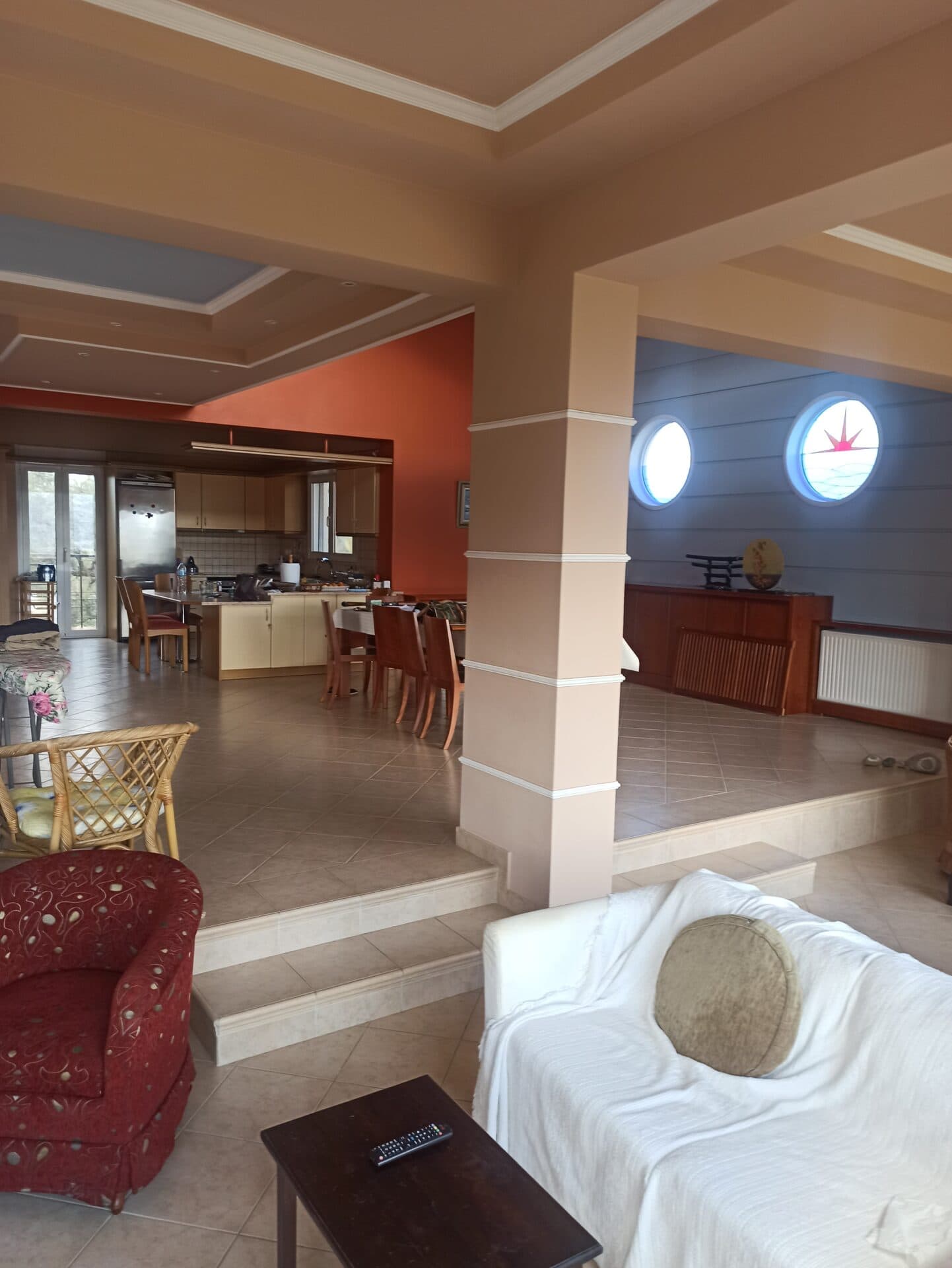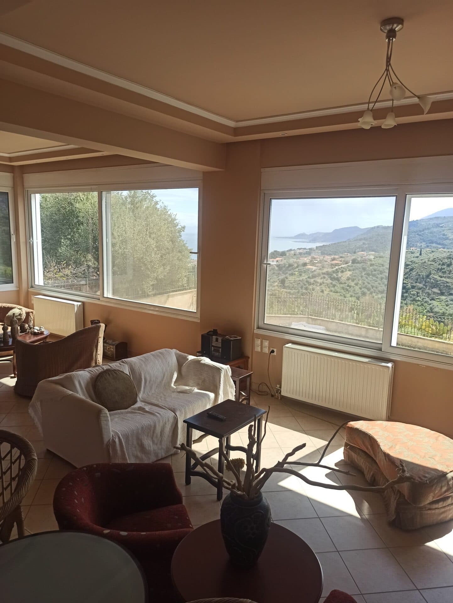 For sale a luxury three-storey maisonette in Ano Akrata, Prefecture of Achaia, Ampelos area, with a total area of 340 sq.m. , (230 sq.m. first floor + second floor) and basement (110 sq.m.) with 4 bedrooms, 2 living rooms, fireplace, 2 kitchens, 5 bathrooms, autonomous oil heating, heavy-duty aluminum frames, alarm, solar, 3 air conditioners, 4 balconies overlooking the sea, yard, garden, 2500 sq.m. , swimming pool, storage room, barbecue and closed garage. Year of construction 2006. Price: 600,000 euros. The address on the map is indicative of the area where the property is located.